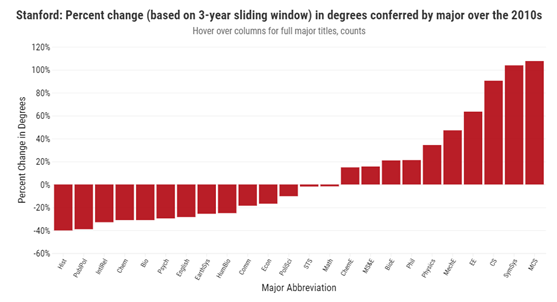 斯坦福大学在近十年间,数学与计算机科学(MCS)、Symbolic systems、CS三大专业的增幅最高。