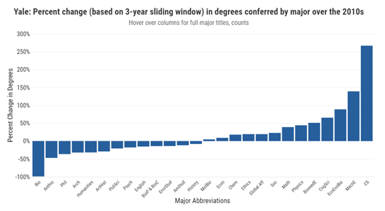 在耶鲁大学,同样CS专业有最大幅度的增长。但与此同时,经济学、政治科学在耶鲁更具规模。事实上,在2017-2018年度,经济学专业比CS专业授予学位的数量高一倍以上。