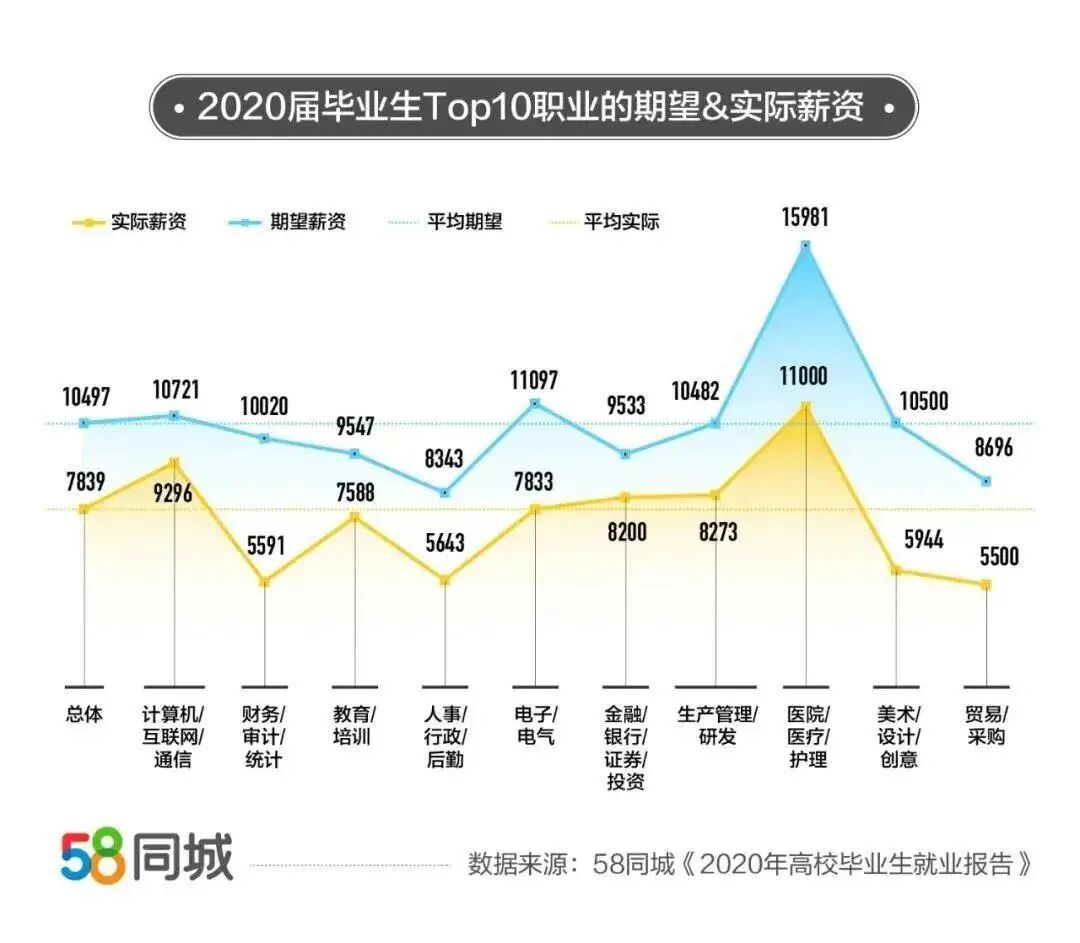 《2020年高校毕业生就业报告》数据表明,排名实际薪资榜前三岗位分别是医院/医疗/护理、计算机/互联网/通信、生产管理/研发,月薪分别为11000元、9269元和8273元。